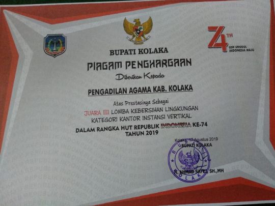 Hal demikian terpampang jelas dalam piagam penghargaan yang diterima PA Kolaka. Dalam piagam penghargaan yang ditandatangai Bupati Kolaka tertanggal 17 Agustus 2019 disebutkan bahwa piagam tersebut diberikan kepada PA Kolaka atas prestasinya sebagai Juara III Lomba Kebersihan Lingkungan Kategori Kantor Instransi Vertikal se-Kabupaten Kolaka.