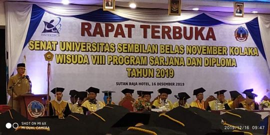 Bertempat di gedung pertemuan Hotel Sutan Rujan Kolaka, Senin (16/12/2019) dilaksanakan seremoni Rapat Terbuka Rektor USN Kolaka dan jajarannya. Pelaksanaan wisuda tersebut merupakan rangkaian akhir proses belajar yang diikuti mahasiswa di kampus negeri satu-satunya di Kolaka.